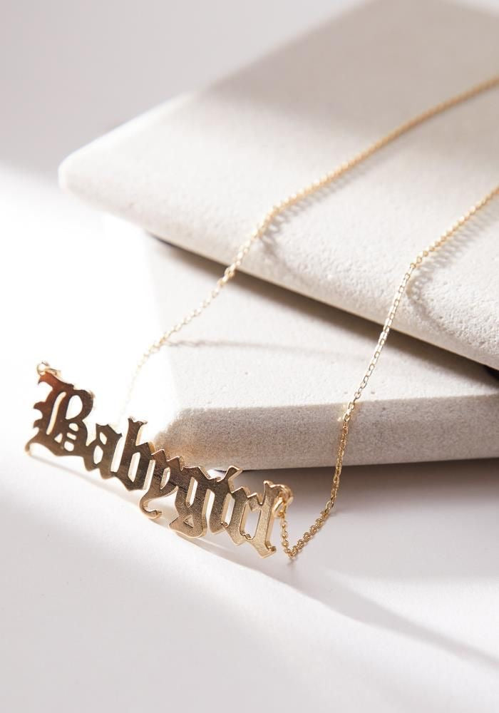 This dainty necklace is ideal for the sophisticated woman who wants to add a touch of nostalgia to her look. Any lady would want to wear it because it has the inscription "Baby Girl" written in Old English lettering.